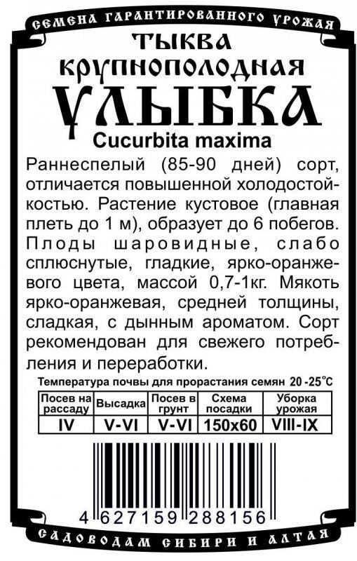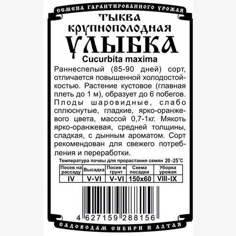 Раннеспелый (85-90 дней) сорт, отличается повышенной холодостойкостью. Растение кустовое (главная плеть до 1 м), образует до 6 побегов. Плоды шаровидные, слабо сплюснутые, гладкие, ярко-оранжевого цвета, массой 0,7-1кг. Мякоть ярко-оранжевая, средней толщины, сладкая, с дынным ароматом. Сорт рекомендован для свежего потребления и переработки.