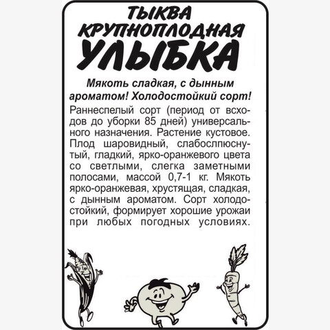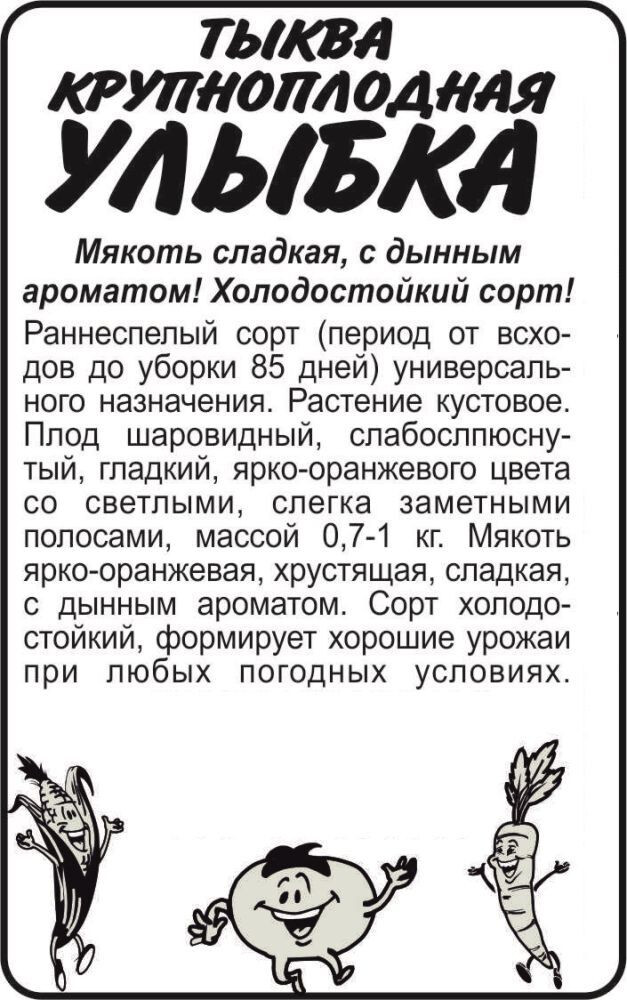 Раннеспелый сорт (период от всходов до уборки 85 дней) универсального назначения. Растение кустовое. Плод шаровидный, слабосплюснутый, гладкий, ярко-оранжевого цвета со светлыми, слегка заметными полосами, массой 0,7 – 1 кг. Мякоть ярко-оранжевая, хрустящая, сладкая, с дынным ароматом. Сорт холодостойкий, формирует хорошие урожаи при любых погодных условиях. Место посадки: легкие плодородные нейтральные почвы. Лучшие предшественники: картофель, лук, капуста, корнеплодные культуры и бобовые. Можно размещать на старых компостных кучах Освещение: освещенные участки, переносит легкое затенение Предпосевная подготовка: не требуется. Для улучшения всхожести выбирают семена возрастом 3-5 лет, замачивают в 1% растворе марганцовки на 15 минут Сроки посева: при прогревании почвы до 10-12°C, когда минует угроза возвратных заморозков Посев на рассаду: не предусмотрен Посев в грунт: высевают в открытый грунт по 2-3 штуки в лунку, когда почва прогреется до температуры 10-12°С на глубину 10 см и минует угроза возвратных заморозков. Глубина заделки семян 3-5 см, на легких почвах до 7 см. Посадочный интервал не менее 1 м между лунками с междурядьями 1,5 м. При раннем посеве в открытый грунт необходимо временное укрытие пленкой Пикировка/перевалка: не предусмотрено Уход: рыхление почвы и умеренные поливы. Для получения крупных плодов на растении оставляют по 2-4 завязи, а плети прищипывают. В период цветения-плодообразования проводят подкормку комплексным минеральным удобрением. Сбор урожая: убирают в полной спелости вместе с плодоножкой (август-сентябрь)