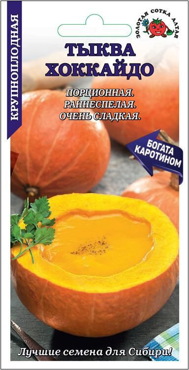 Сорт раннеспелый. Растение стелющееся. Тыква Хоккайдо очень похожа на большую грушу. Каждая тыковка весит от 700 до 2500 грамм. Кожура яркая, очень красивого красно-оранжевого цвета. Сладкая плотная мякоть, вкус которой можно сравнить с каштаном или сладким картофелем, богата каротином. Тыква порционная, может также использоваться как горшочек для супа, овощей и любого гарнира с мясом и грибами или как глубокая тарелка для экзотических салатов. Тыква Хоккайдо способна на многое! Вы сможете запекать ее в духовке и съесть в сыром виде. Сорт теплолюбивый и влаголюбивый. Плохо переносит засуху.