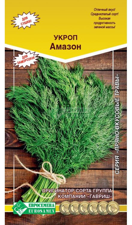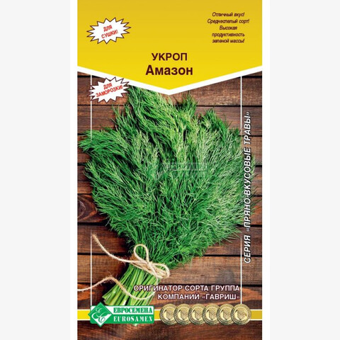 Укроп - одна из тех универсальных пряно-вкусовых трав, которые хороши для самых разных блюд. Почти любой суп вкуснее с укропом, обычная яичница становится изысканной, а банальное картофельное пюре - пикантным. Укроп Амазон – среднеспелый (40-45 дней от всходов до уборки урожая) сорт с зелеными листьями сизого оттенка, сочный, очень ароматный. Сорт характеризуется неприхотливостью. Урожайность на зелень 1,4-4,1 кг/м2, на специи 2,9-6,7 кг/м2. Ценится за дружное формирование сочной и нежной зелени, продолжительный период хозяйственной годности. Рекомендуется для сушки, замораживания, приготовления разнообразных приправ, засолки и маринования. Длительное время сохраняет ценные вкусовые свойства и после срезки. Все надземные части растения содержат эфирное масло и обладают очень приятным вкусом. Настой травы укропа понижает кровяное давление, расширяет сосуды, расслабляет кишечник.