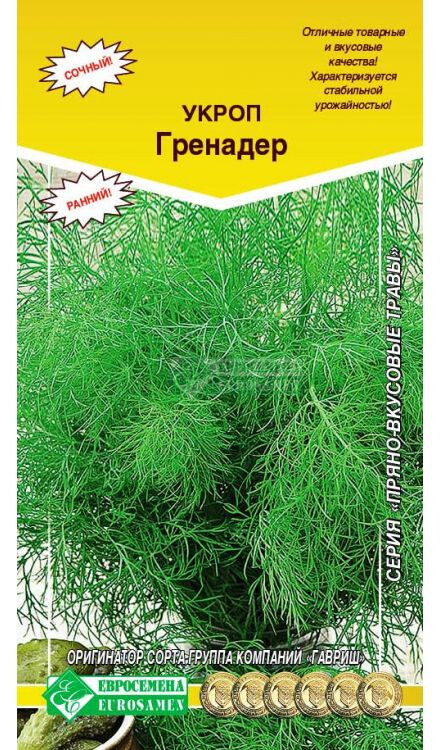 Укроп – однолетнее растение, которое можно встретить на каждом огородном участке, является ценным источником полезных элементов и витаминов, способствует ускорению обмена веществ и позволяет быстрее вывести шлаки и вредные вещества из организма. Укроп Гренадер- раннеспелый сорт, период от всходов до уборки зеленой массы 30-35 дней , 70-90 дней от всходов до уборки на специи. Предназначен для выращивания на зелень и специи. Посев в грунт производится в конце апреля – начале мая. Розетка крупная, приподнятая, высотой 26-29 см. Листья зеленые с крупными сегментами. Зелень нежная, сочная, обладает высокой ароматичностью. Сорт характеризуется стабильной урожайностью, неприхотливостью. Урожайность на зелень 1,4-3,1 кг/м2, на специи 2,9-5,7 кг/м2.