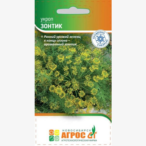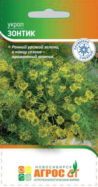 Раннеспелый высокоурожайный сорт. Растение в фазу цветения высотой до 1 м, полураскидистое, образует крупный многолучевой зонтик. Листья зеленые, очень ароматные, нежные, сочные. Достоинства сорта: рано и дружно формирует урожай зелени, к концу сезона образует высококачественный ароматный зонтик. Рекомендуется для употребления в свежем виде, замораживания и использования в качестве специи для консервирования овощей. Особенности выращивания: семена высевают рядками, на глубину 0,5 см, в несколько сроков за сезон с интервалом 20-25 дней. Посев не загущать. Необходим регулярный полив. 100 - V - 20x20 VI-IX