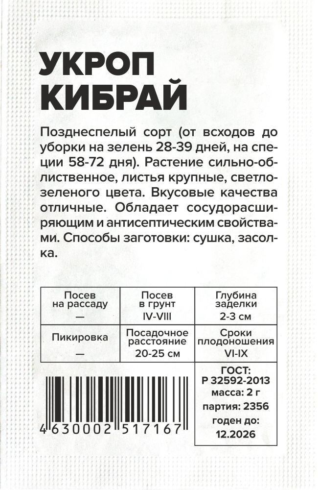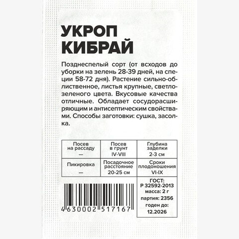 Позднеспелый сорт (от всходов до уборки на зелень 28-39 дней, на специи 58-72 дня). Растение сильно-облиственное, листья крупные, светло-зеленого цвета. Вкусовые качества отличные. Обладает сосудорасширяющим и антисептическим свойствами. Способы заготовки: сушка, засолка. Место посадки: предпочитает легкосуглинистые или супесчаные почвы. В качестве предшественника подходят любые пропашные культуры, огурцы, капуста, кроме растений семейства сельдерейные Освещение: обильное, выносит затенение Предпосевная подготовка: не требуется, для более ранних и дружных всходов перед посевом можно замочить семена на 10-15 минут в воде температурой +50°С Сроки посева: высевают в несколько сроков с интервалом 15-20 дней с середины апреля (в зависимости от региона, когда почва прогреется до +10...12°С) по август Посев на рассаду: не предусмотрен Посев в грунт: сеют рядками, оставляя междурядья 20-25 см, сплошным способом или в лунки для получения пучков. Семена заделывают на глубину 0,5-1 см. Для получения весной более ранней зелени можно производить подзимний посев сухим способом Пикировка/перевалка: не предусмотрена Уход: заключается в прополке и поливе Сбор урожая: проводится выборочно, по мере отрастания зеленой массы. Срок хранения при +1°С - две недели
