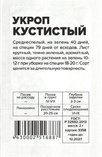Среднеспелый, на зелень 40 дней, на специи 79 дней от всходов. Лист крупный, темно-зеленый, ароматный, масса одного растения на зелень 10-12 г при уборке на специи 18-20 г. Сорт ценится за длительную товарность. Место посадки: предпочитает легкосуглинистые или супесчаные почвы. В качестве предшественника подходят любые пропашные культуры, огурцы, капуста, кроме растений семейства сельдерейные Освещение: обильное, выносит затенение Предпосевная подготовка: не требуется, для более ранних и дружных всходов перед посевом можно замочить семена на 10-15 минут в воде температурой +50°С Сроки посева: высевают в несколько сроков с интервалом 15-20 дней с середины апреля (в зависимости от региона, когда почва прогреется до +10...12°С) по август Посев на рассаду: не предусмотрен Посев в грунт: сеют рядками, оставляя междурядья 20-25 см, сплошным способом или в лунки для получения пучков. Семена заделывают на глубину 0,5-1 см. Для получения весной более ранней зелени можно производить подзимний посев сухим способом Пикировка/перевалка: не предусмотрена Уход: заключается в прополке и поливе Сбор урожая: проводится выборочно, по мере отрастания зеленой массы. Срок хранения при +1°С - две недели