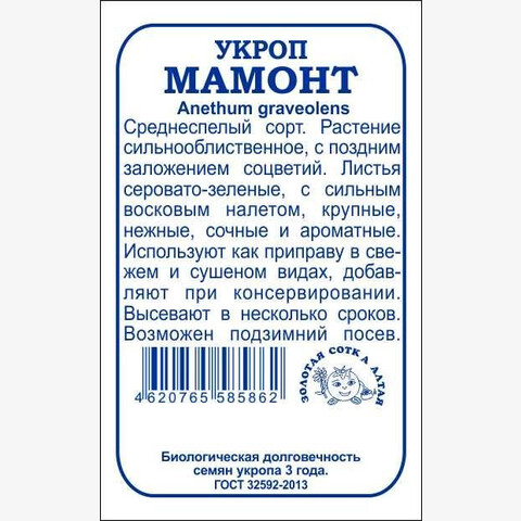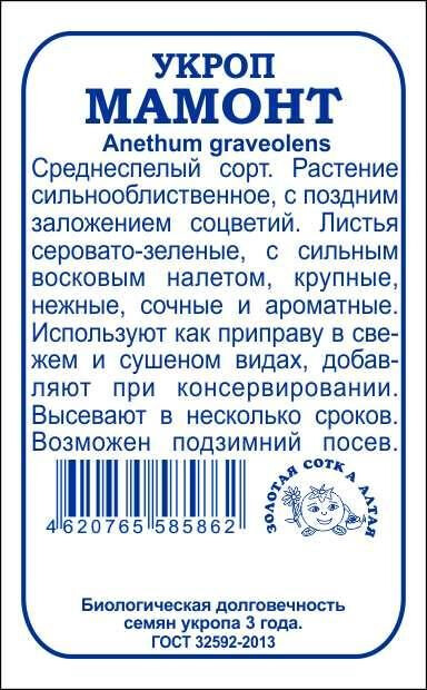 Среднеспелый высокоурожайный сорт. От всходов до сбора зелени 40-50 дней, на специи собирают через 80-90 дней. Растение сильнооблиственное, с поздним заложением соцветий. Листья серовато-зеленые, с сильным восковым налетом, крупные, нежные и очень ароматные. Укроп широко применяется в кулинарии, при консервировании и в качестве лекарственного растения, содержит фитонциды и при засолке овощей не только придает им специфический вкус, но и предохраняет от плесени и порчи.