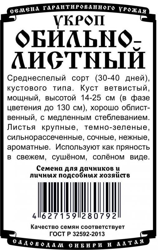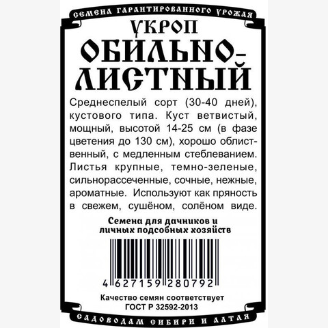 Среднеспелый сорт (30-40 дней), кустового типа. Куст ветвистый, мощный, высотой 14-25 см (в фазе цветения до 130 см), хорошо облиственный, с медленным стеблеванием. Листья крупные, темно-зеленые, сильнорассеченные, сочные, нежные, ароматные. Используют как пряность в свежем, сушёном, солёном виде.