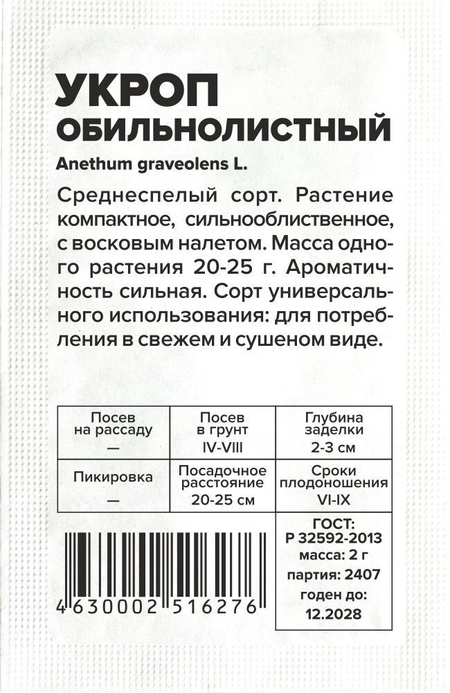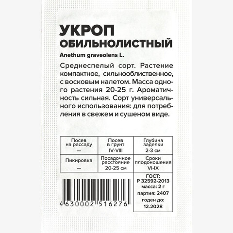 Среднеспелый сорт. Растение компактное, сильнооблиственное, с восковым налетом. Масса одного растения 20-25 г. Ароматичность сильная. Сорт универсального использования: для потребления в свежем и сушеном виде. Место посадки: предпочитает легкосуглинистые или супесчаные почвы. В качестве предшественника подходят любые пропашные культуры, огурцы, капуста, кроме растений семейства сельдерейные Освещение: обильное, выносит затенение Предпосевная подготовка: не требуется, для более ранних и дружных всходов перед посевом можно замочить семена на 10-15 минут в воде температурой +50°С Сроки посева: высевают в несколько сроков с интервалом 15-20 дней с середины апреля (в зависимости от региона, когда почва прогреется до +10...12°С) по август Посев на рассаду: не предусмотрен Посев в грунт: сеют рядками, оставляя междурядья 20-25 см, сплошным способом или в лунки для получения пучков. Семена заделывают на глубину 0,5-1 см. Для получения весной более ранней зелени можно производить подзимний посев сухим способом Пикировка/перевалка: не предусмотрена Уход: заключается в прополке и поливе Сбор урожая: проводится выборочно, по мере отрастания зеленой массы. Срок хранения при +1°С - две недели