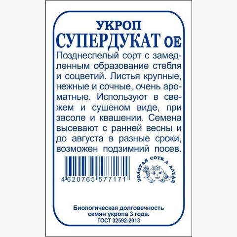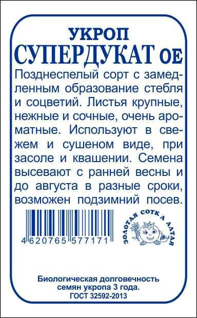 Позднеспелый сорт с замедленным образованием стебля и соцветий. Листья крупные, нежные, сочные, очень ароматные, длительное время сохраняют хозяйственную годность. Зелень используют как приправу к горячим и холодным блюдам, солят и сушат; семена — для отдушки кондитерских изделий, соцветия и стебли добавляют в маринады, соленья и при квашении капусты. Укроп содержит фитонциды и при засолке овощей не только придает им специфический вкус, но и предохраняет от плесени и порчи.