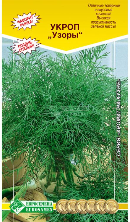 Укроп – однолетнее растение, которое можно встретить на каждом огородном участке, является ценным источником полезных элементов и витаминов, способствует ускорению обмена веществ и позволяет быстрее вывести шлаки и вредные вещества из организма. Это одна из тех универсальных трав, которые хороши для самых разных блюд. Почти любой суп вкуснее с укропом, обычная яичница становится изысканной, а банальное картофельное пюре - пикантным. Узоры - высокоурожайный, позднеспелый сорт (от массовых всходов до уборки на зелень 40-55 дней, на специи 75-90 дней). Растение компактное, с высокой продуктивностью зеленой массы. Листья крупные, зеленые, сочные, нежные, с чудесным ароматом, высоких товарных качеств. Благодаря медленному стеблеванию, сорт продолжительное время сохраняет фазу хозяйственной годности. Используется на зелень, а также для сушки и заморозки.