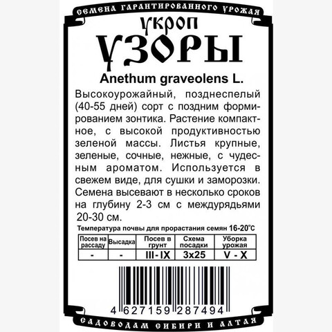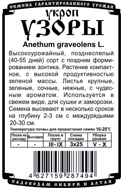 Высокоурожайный, позднеспелый (40-55 дней) сорт с замедленным стеблеванием. Растение компактное, с высокой продуктивностью зеленой массы. Листья крупные, зеленые, сочные, нежные, с чудесным ароматом. Используется в свежем виде, для сушки и заморозки. Семена высевают в несколько сроков на глубину 2-3см с междурядиями 20-30см.