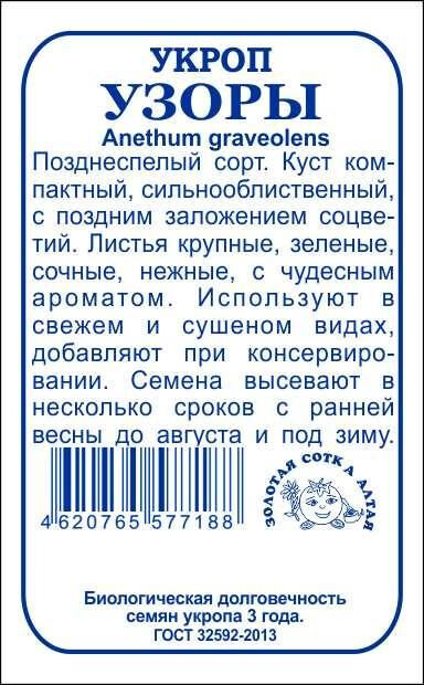 Позднеспелый сорт. Куст компактный, сильнооблиственный, с поздним заложением соцветий. Листья крупные, зеленые, сочные, нежные, с чудесным ароматом. Используют в свежем и сушеном видах, добавляют при консервировании. Семена высевают в несколько сроков с ранней весны до августа и под зиму.