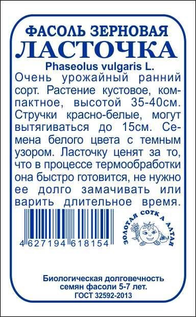 Очень урожайный ранний сорт. Растение кустовое, компактное, высотой 35-40см. Стручки красно-белые, могут вытягиваться до 15см. Семена белого цвета с темным узором. Ласточку ценят за то, что в процессе термообработки она быстро готовится, не нужно ее долго замачивать или варить длительное время.