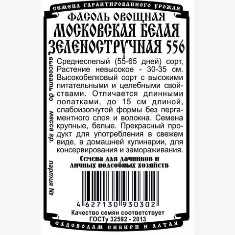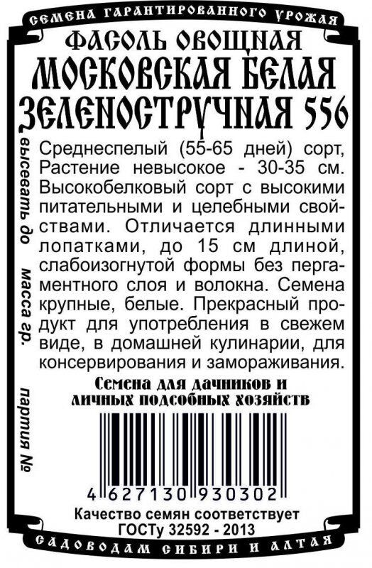 Среднеспелый сорт, период от всходов до плодоношения 55-65 дней. Растение невысокое - 30-35см. Высокобелковый сорт с высокими питательными и целебными свойствами. Отличается длинными лопатками, до 15 см длиной, слабоизогнутой формы без пергаментного слоя и волокна. Семена крупные, белые. Прекрасный продукт для употребления в свежем виде, в домашней кулинарии, для консервирования и замораживания.