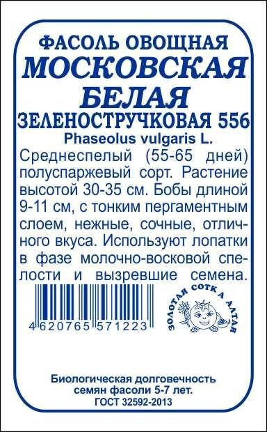 Высокоурожайный среднеспелый сорт, выращиваемый с целью получения и дальнейшего использования в кулинарии недозрелых бобов (фаза молочно-восковой спелости) и зерна. От полных всходов до сбора лопаток 55-65 дней. Растение средневетвистое, кустовое, раскидистое, стебель высотой 30-35 см. Бобы крупные, длиной 9-11 см, плоско-цилиндрические, изогнутые, в технической спелости светло-зеленые, нежные и сочные, прекрасного сладковатого вкуса, при созревании появляется слабовыраженный пергаментный слой. Вызревшее зерно крупное, белое, отличного качества. Сорт подходит для приготовления супов, гарниров и самостоятельных блюд, а также консервирования.