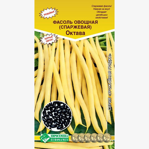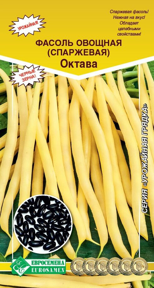 Спаржевую фасоль выращивают во всём мире. Столь широкое распространение она нашла благодаря своим удивительным свойствам, ведь фасоль не впитывает в себя токсины из почвы и из внешней среды. В ней есть фолиевая кислота, она богата на железо и молибден. Эти микроэлементы необходимы для человеческого организма, более того, это отличное средство, чтобы сбросить несколько килограммов, ведь фасоль способна насыщать организм, подавляя чувство голода. Октава - раннеспелый сорт со сроком вегетации 45-50 дней. Отличается компактностью и высокой урожайностью. Растение формирует кусты высотой до 40 см. Бобы прямые, узкие, светло-желтые, длиной 17 см, без пергаментного слоя и волокна, с нежной вкусной мякотью. Цветки мелкие, фиолетовые. Бобы черного цвета. Сорт хорош как для кулинарии, так и для замораживания.