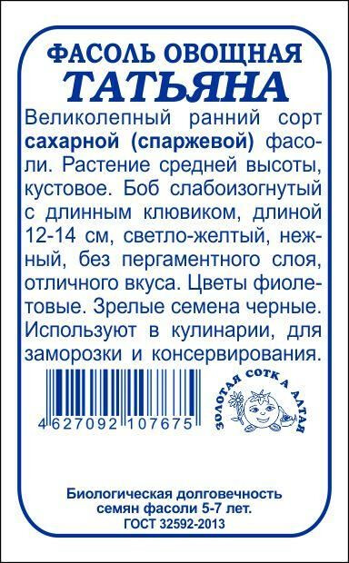 Великолепный раннеспелый сорт сахарной (спаржевой) фасоли. Растение средней высоты, кустовое. Бобы средней ширины, длиной12-14 см, слабоизогнутые с длинным клювиком, светло-желтые, нежные, без пергаментного слоя и волокна, отличного вкуса. Цветы фиолетовые. Зрелые семена черные. Используют в кулинарии, для заморозки и консервирования в фазе молочно-восковой спелости.