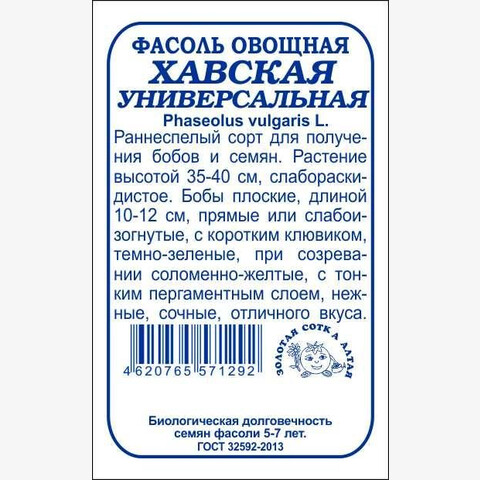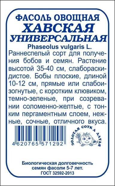 Раннеспелый сорт для получения бобов и семян. Растение высотой 35-40 см, слабораскидистое. Бобы плоские, длиной 10-12 см, прямые или слабоизогнутые, с коротким клювиком, темно-зеленые, при созревании соломенно-желтые, с тонким пергаментным слоем, нежные, сочные, отличного вкуса.