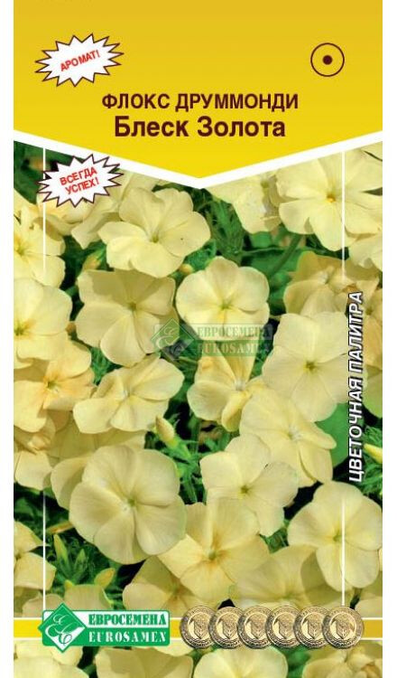 Phlox drummondii Isabellina, yellow Флокс друммонди- однолетнее растение семейства Синюховые , означающее в переводе с греческого огонь и завезенное в Европу английским ботаником Друммондом. Флоксы привлекательны для выращивания в миксбордерах и на клумбах, их очень любят все цветоводы из-за неприхотливости и ярких пышных цветочных соцветий. Флоксы никогда не перестают удивлять и восхищать нас своей цветовой окраской невероятной красоты, растут пышными охапками, ну чем не идеальный вариант для украшения и декорирования сада? Цветут с начала лета и до глубокой осени. Флокс БЛЕСК ЗОЛОТА представляет собой низкий пышный кустик с цветками приятного кремового оттенка, сочетающегося с сочной зеленью листьев. Отличающийся засухоустойчивостью, он идеален для подвесных кашпо и вазонов. При выборе подходящих соседей для них стоит принять во внимание то, что сероватая полынь, светло-розовый лихнис и овсяница хорошо комбинируются с благородными флоксами кремового оттенка, он гармоничен с колокольчиками, львиным зевом и невидимками. Высота растения-30 см Диаметр цветка-3 см