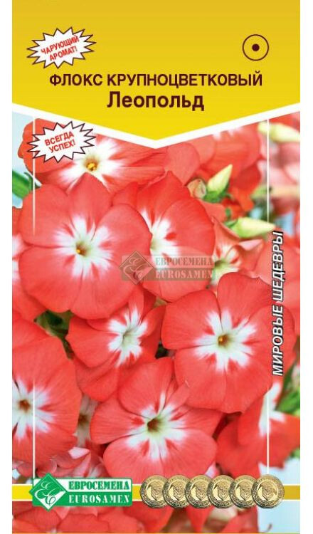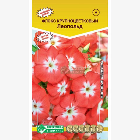 Флокс Друммонда – однолетник с периодом цветения более 3 месяцев, поэтому и приобрел такую популярность среди цветоводов, а само его выращивание доступно любому владельцу загородного дома, дачи или усадьбы. Растение представляет собой небольшой, но пышный кустик, который покрыт плотно расположенными цветами. Оно характеризуется более длительным периодом и обильностью цветения, никогда не перестают удивлять и восхищать своей цветовой окраской. Леопольд - украсит сад обилием красивой зелени, а яркие большие, плотные соцветия превратят кусты в огромные букеты и надолго подарят ощущение праздника. Изящные цветочки покорят эффектным сочетанием лососевых лепестков с белым глазком в центре, и наполнят воздух чарующим ароматом. Благодаря пышному и длительному цветению, флокс широко используется для оформления каменистых садиков и клумб, украшения балконных ящиков, горшков и вазонов. Высота растения-45 см Диаметр цветка-4 см