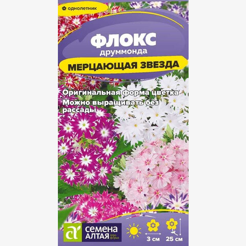 Яркоцветущее неприхотливое растение высотой до 25 см, сильноветвящееся от основания. Цветки звездчатой формы, двухцветные, широко раскрытые, до 3-х см в диаметре, собраны в плотные соцветия-щитки на верхушках стеблей. Флокс широко применяют для групповых посадок в массивах, на клумбах, рабатках, бордюрах, выращивают в балконных ящиках, он отлично смотрится в садовых композициях, реже используют для срезки. Свето- и теплолюбивое растение, для хорошего цветения необходим регулярный полив. К почвам нетребовательно, но наибольшей декоративности достигает на плодородной почве. На рассаду семена высевают с конца марта. Емкости наполняют обычной посевной землей, проливают розовым раствором марганцовокислого калия. Сверху насыпают прокаленный речной песок, который должен пропитаться влагой от грунта. Семена раскладывают в продавленные бороздки глубиной 3 мм, плотно вдавливают в грунт, не заделывая сверху. Посевы накрывают пленкой и помещают в притененное место. Оптимальная температура для прорастания семян +18-20°С. Всходы появляются через 10-15 дней. При появлении первого настоящего листа проводят пикировку. В открытый грунт рассаду высаживают в конце мая – начале июня, когда минует угроза возвратных заморозков. Посадочный интервал 20-25 см. Можно выращивать посевом семян в открытый грунт в самые ранние сроки. Цветение начинается в июне-июле и продолжается до заморозков.