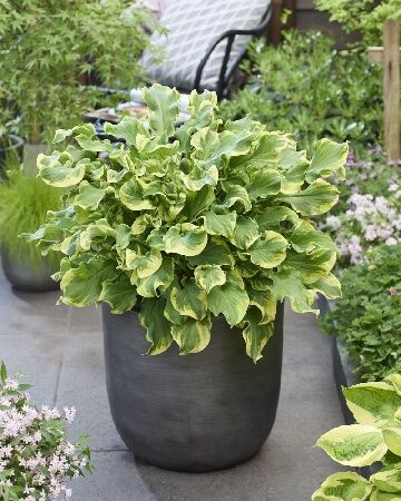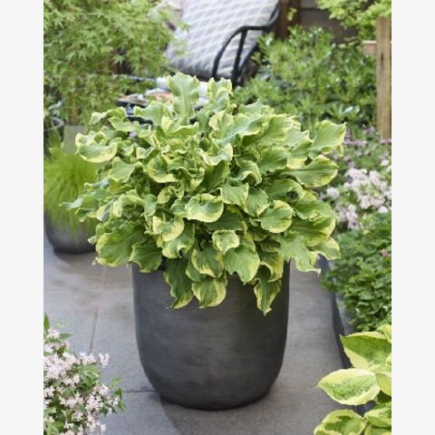 • кудрявая хоста среднего размера светло-зеленая с кремовой каймой, быстрое нарастание, Н-45см, Ø 60см