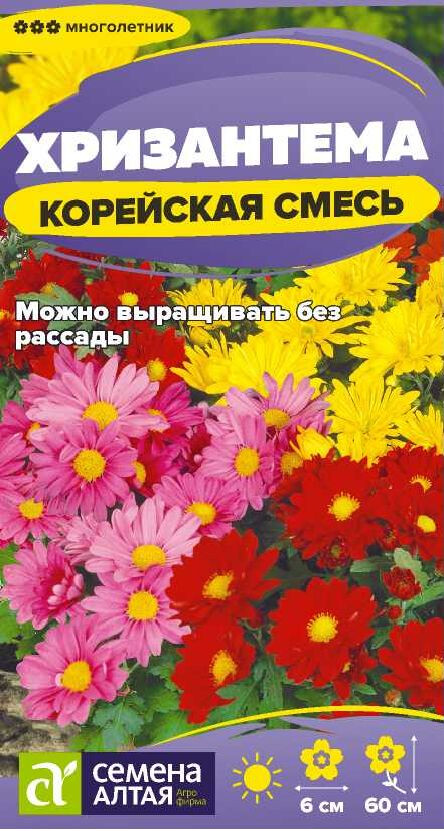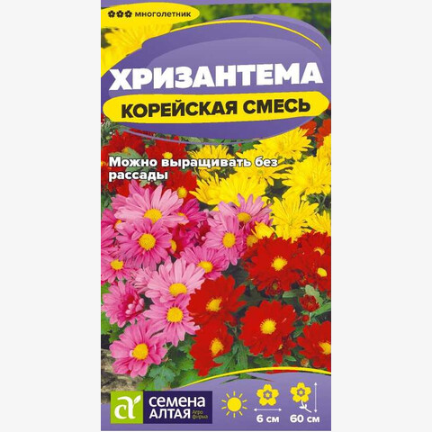 Смесь многолетней корейской хризантемы для украшения осенних цветников. Формирует хорошо разветвленные кустики высотой до 60 см, цветущие простыми и полумахровыми соцветиями-корзинками разнообразной окраски диаметром 4-6 см. Зацветает через 4-5 месяцев от посева. Кусты образуют многочисленную корневую поросль, с помощью которой понравившиеся растения можно размножить следующей весной. Используют в высоких бордюрах и для срезки. В срезке сохраняет декоративность до 3-х недель. Холодостойкое и морозоустойчивое растение, зимует в открытом грунте. Устойчиво к засухе. Предпочитает солнечные участки на плодородной, хорошо дренированной, нейтральной по кислотности почве. При рассадном способе выращивания семена высевают в конце февраля - марте в рассадные ящики, глубина заделки семян 0,3 см. При температуре +18-25°С всходы появляются через 10-20 дней. После появления одного-двух настоящих листочков сеянцы пикируют. На постоянное место рассаду высаживают, начиная с середины мая. Посадочный интервал – 35-40 см. Возможен прямой посев семян в открытый грунт в начале мая. При густом взращивании семян следует обязательно проредить всходы. Возможен подзимний посев семян в открытый грунт. Цветение в конце лета до осенних холодов.