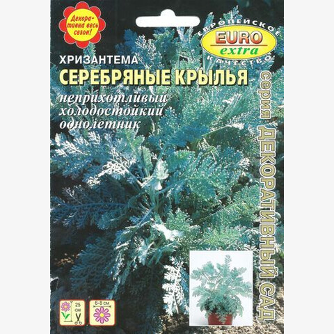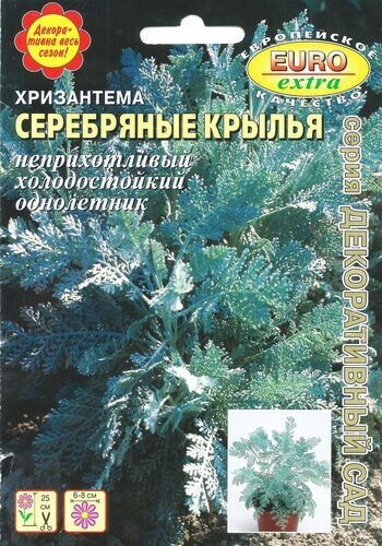 Многолетнее неприхотливое растение, культивируемое как однолетнее. Куст компактный, сильноветвистый, до 25 см высотой. Листья перисто-рассеченые или глубоко разрезанные,черешчатые, мягко опушенные, светло-серо-голубые. Цветки корзинки диаметром 1,5 см,желтые, собраны в верхушечные соцветия, появляются в июле. Хризантема Серебряные крылья будет радовать Вас своей привлекательной декоративной листвой весь сезон. Растения красиво смотрятся в групповых посадках, в цветниках и на газонах,очень хорошо вдоль бордюров, в уличных вазонах и балконных ящиках. Привлекательная особенность растения-сильно приятный запах его листьев, многократно усиливающийся при их растирании.