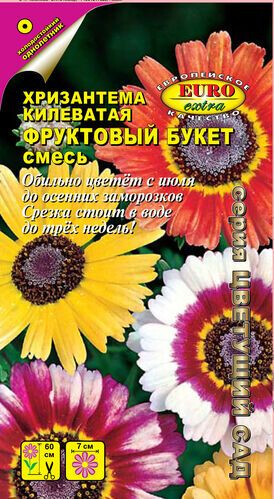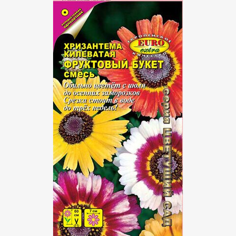 Разноцветная смесь хризантемы килеватой отличных однолетних надёжных сортов порадует Вас обильным и продолжительным цветением с июля и до осенних заморозков. Цветки многочисленные, простые 5-7 см в диаметре, душистые, на прочных цветоносах. Кусты густые, компактные, шаровидные, высотой около 60 см. Используется для украшения цветников, миксбордеров, в горшечной и контейнерной культуре, а также на срезку, которая стоит в воде до трех недель.
