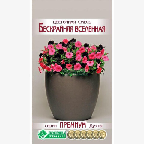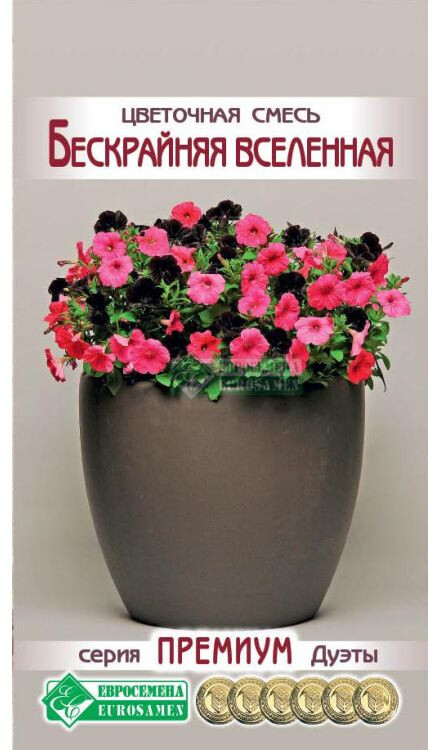 (Смесь состоит из: Petunia grandiflora Supercascade F1 Rose & Petunia multiflora Debonair F1 Black Cherry) Сегодня петуния стала украшением клуб, рабаток, окон, балконов, вазонов, цветников, бордюров – где только ее не встретишь! Роскошные каскады цветов радуют нас с наступления лета до самых холодов. Щедрое цветение, фантастическое сочетание окрасок цветков создают нарядную, праздничную атмосферу, а контрастные расцветки придают цветкам некую торжественность. Это просто удивительно. Смесь создает ощущение, будто она полностью состоит только из восхитительных цветков. Цветки различного размера, но все они гармоничны и прекрасны. Никакое другое растение в такой степени, как петуния, не подходит для оформления комфортных и романтических уголков отдыха, не боясь при этом ни дождя, ни ветра, ни жары, стойко выдерживает любую непогоду. Ухаживать за растением несложно, отсюда и ее популярность среди цветоводов. В современном ландшафте это одна из самых популярных цветочных культур, прекрасный неприхотливый цветок с тонким ароматом. Огромное многообразие расцветок и разновидностей позволяет создавать красивые цветовые комбинации из этой культуры. Бескрайняя Вселенная-впечатляющий дуэт обильно цветущих петуний для всех видов озеленения!