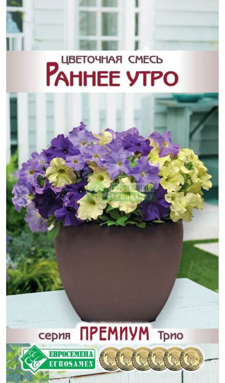 Сегодня петуния стала украшением клуб, рабаток, окон, балконов, вазонов, цветников, бордюров – где только ее не встретишь! Роскошные каскады цветов радуют нас с наступления лета до самых холодов. Щедрое цветение, фантастическое сочетание окрасок цветков создают нарядную, праздничную атмосферу, а контрастные расцветки придают цветкам некую торжественность. Это просто удивительно. Смесь создает ощущение, будто она полностью состоит только из восхитительных цветков. Цветки различного размера, но все они гармоничны и прекрасны. Никакое другое растение в такой степени, как петуния, не подходит для оформления комфортных и романтических уголков отдыха, не боясь при этом ни дождя, ни ветра, ни жары, стойко выдерживает любую непогоду. Ухаживать за растением несложно, отсюда и ее популярность среди цветоводов. В современном ландшафте это одна из самых популярных цветочных культур, прекрасный неприхотливый цветок с тонким ароматом. Огромное многообразие расцветок и разновидностей позволяет создавать красивые цветовые комбинации из этой культуры. Раннее Утро-впечатляющее трио обильно цветущих петуний для всех видов озеленения!