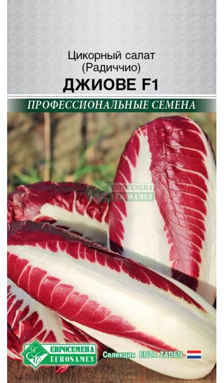 Радиччио – разновидность цикория салатного с красной листвой. Родина овощного растения Италия, где его знают как красный салатный цикорий, и в России он тоже широко известен. Радиччио Джиове F1 - кочанный гибрид сортотипа Тревизо с очень необычной окраской для выращивания в открытом грунте. Период вегетации 80-90 дней после высадки рассады. Цвет листа обусловлен наличием антоциана – одного из самых сильных антиоксидантов. Именно это вещество придает бордовую окраску листьям. Прожилки совершенно белые. Кочан вытянутый, длиной 22-23 см, плотный весом до 600 грамм, быстро набирает вес. Назначение универсальное, предпочтительно употребление в свежем виде. Особенности салата цикорного Радиччио Джиове F1 - кочан на срезе имеет красивый мраморный рисунок. Отлично смотрится в салатных смесях. Необычная окраска всего растения дает возможность использовать его в ландшафтных композициях. Высокая устойчивость к цветушности позволяет получать кочаны высокого качества с каждого растения. Варить или жарить листья нужно не более 5 минут, чтобы сохранить максимум полезных веществ.