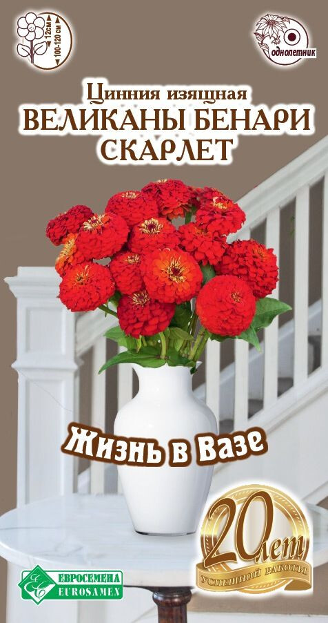 Цинния – красиво цветущее растение, образующее отдельный род семейства Астровые. Наиболее распространена она на своей исторической родине, в Мексике. Великаны Бенари - очень изящный и крайне продуктивный сорт циннии, который легко выращивать. Полностью махровые, крупные цветки на длинных прочных стеблях идеально подходят для выращивания на срез, у этой циннии длительный срок жизни в вазе без потери декоративных качеств. Она обладает множеством расцветок и способна стать украшением любого цветника и интерьера, не нуждается в особом уходе, что делает ее весьма популярной. Отличается продолжительным цветением до поздней осени. Скарлет- весьма сочная окраска циннии, это растение заднего плана цветников, идеально подходит для создания ярких цветочных массивов.