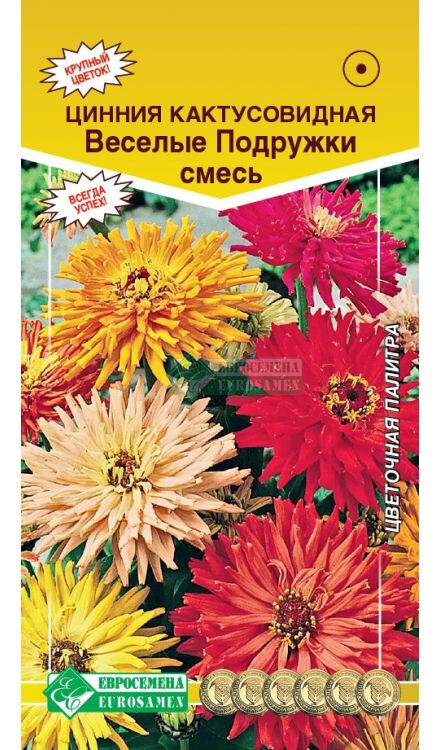 Цинния — цветок из Южной Мексики, который очень популярен среди садоводов и ландшафтных дизайнеров. В середине XVIII века это декоративное растение украшало аристократические сады, а в наше время благодаря своей красоте и неприхотливости завоевало уже весь мир. Циннии ещё называют майорами, цветами офицеров, их прозвали так за прямые жёсткие стебли и горделиво посаженные соцветия. Веселые Подружки- фейерверк из ярких цветков в течение всего лета! Смесь с блеском впишется во все цветочные композиции сада, придуманные Вами. Своими причудливыми оттенками и своей грациозной и величественной формой, эта цинния способна очаровать всех без исключения. Отличаются обильным и продолжительным цветением, прочными ветвящимися цветоносами. Соцветия с высокой устойчивостью к неблагоприятным погодным условиям. Идеально подходят для срезки. Цветет с июня до заморозков.