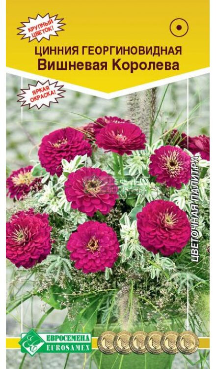 Цинния — цветок из Южной Мексики, который очень популярен среди садоводов и ландшафтных дизайнеров. В середине XVIII века это декоративное растение украшало аристократические сады, а в наше время благодаря своей красоте и неприхотливости завоевало уже весь мир. Циннии ещё называют майорами георгино- цветковыми, так как внешне они очень похожи на георгин, а цветами офицеров их прозвали за прямые жёсткие стебли и горделиво посаженные соцветия. Вишневая Королева - очередная красавица из огромного разнообразия обожаемых в народе, цинний. Еще более многолика и щедра она на цветение. С июля будет радовать крупными цветками темно-вишневой окраски и не потеряет своей романтичности до заморозков. Вас ожидает осенний фейерверк из крупных цветков по случаю окончания лета, с блеском впишется во все цветочные композиции, заполняя промежутки между соседними растениями и, наиболее выигрышно подчеркнет их красоту. Высота растения-80 см Диаметр цветка-13 см