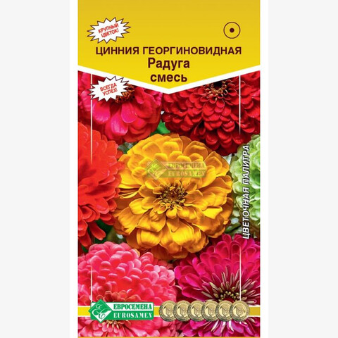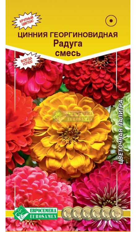 Цинния — цветок из Южной Мексики, который очень популярен среди садоводов и ландшафтных дизайнеров. В середине XVIII века это декоративное растение украшало аристократические сады, а в наше время благодаря своей красоте и неприхотливости завоевало уже весь мир. Циннии ещё называют майорами георгино- цветковыми, так как внешне они очень похожи на георгин, а цветами офицеров их прозвали за прямые жёсткие стебли и горделиво посаженные соцветия. Радуга-фейерверк из ярких цветков в течение всего лета! Смесь с блеском впишется во все цветочные композиции сада, придуманные Вами. Своими причудливыми оттенками и своей грациозной и величественной формой, эта цинния способна очаровать всех без исключения. Отличаются обильным и продолжительным цветением, прочными ветвящимися цветоносами. Соцветия с высокой устойчивостью к неблагоприятным погодным условиям. Идеально подходят для срезки. Цветет с июня до заморозков.