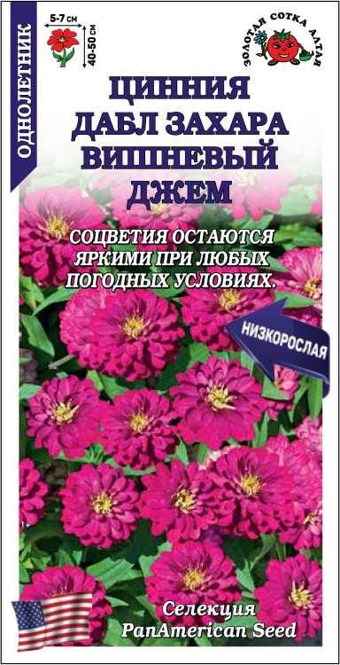 Циннии Double Zahara чрезвычайно обильно цветут в течение всего сезона, невосприимчивы к болезням и устойчивы к непогоде. Кустики пышные, низкорослые, с большим количеством крепких цветоносов и множеством махровых соцветий насыщенной вишневой окраски, не выгорающей и не блекнущей от палящего солнца. Используют для оформления клумб, рабаток и бордюров, высаживают в контейнеры.