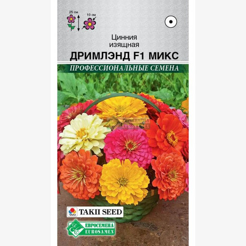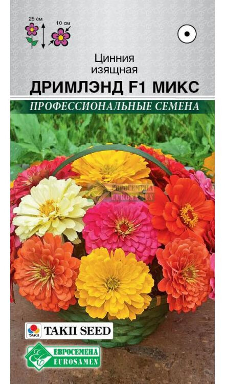 Цинния – красиво цветущее растение, образующее отдельный род семейства Астровые. Наиболее распространена она на своей исторической родине, в Мексике. Дримлэнд - серия раннецветущих, компактных и обильно цветущих цинний с георгиновидными цветками от компании Takii Seed, которая считается самым лучшим гибридом в последние годы в своем сегменте. Удивительный потенциал, стабильное плотное цветение в течение всего сезона, неприхотливость и устойчивость к погодным катаклизмам - вот несомненные достоинства данной серии. Растения отличаются сильным базальным ветвлением, разрастаются отлично вширь, превращаясь, что называется в шар, диаметром 50 см. Крупные цветки самой разнообразной окраски обеспечивают отличное цветочное шоу как в контейнерах, так и в различных цветниках открытого грунта: рабатках, бордюрах и клумбах. Широко используется для создания ярких цветочных массивов, идеальное растение переднего плана. Высокие показатели всхожести и сортовой чистоты!