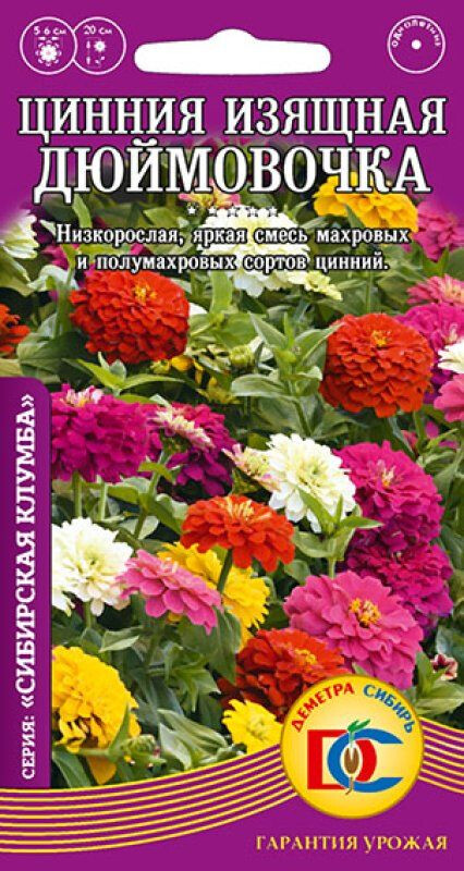 Низкорослая, яркая смесь махровых и полумахровых сортов цинний. Кустики компактные, густоветвистые, высотой 15-20 см. Соцветия 5-6 см. Цветение обильное. Каждый цветок держится на растении более месяца. Используется для групповых и одиночных по садок на клумбах, в рабатках и бордюрах. Подходит для выращивания в горшках и балконных ящиках.