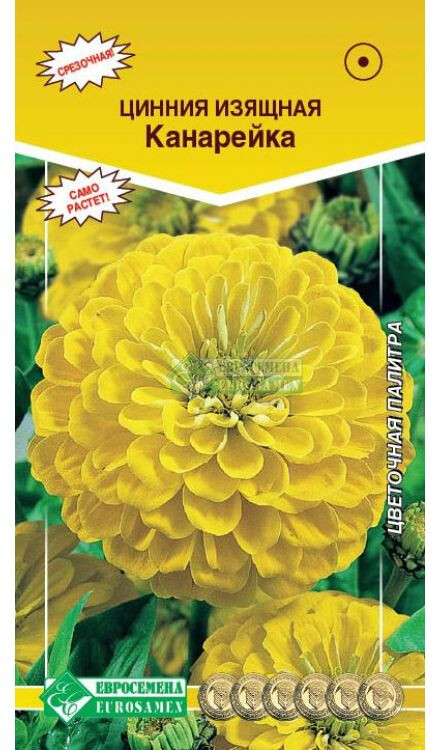 Zinnia elegans Canary Bird Многочисленная георгиновидная группа циннии любима специалистами по садовому дизайну. Этот цветок настолько красив, что радует глаз и оторвать свой взгляд от него просто невозможно. Птичка Канарейка – яркий представитель этой группы цинний. Кусты мощные, ветвистые от основания. Соцветия - желтые с лимонным оттенком, корзинки махровые, плотные. Язычковые цветки лимонно-желтые, удлиненно-овальной формы, расположены черепитчато с чуть приподнятыми краями, трубчатые в центре цветка - более темного цвета. Растения устойчивы к жаре, хорошо выдерживают самые высокие температуры. Цветет обильно с июля по сентябрь. Каждый цветок держится открытым до 30 дней. Удаление отцветших соцветий способствует обильному цветению. Используют для оформления цветников, рабаток и срезки. Долго стоит в вазе, сохраняя декоративность и яркость окраски. Несомненно, она легко завоюет Вашу любовь! Высота растения-80 см Диаметр цветка-12 см