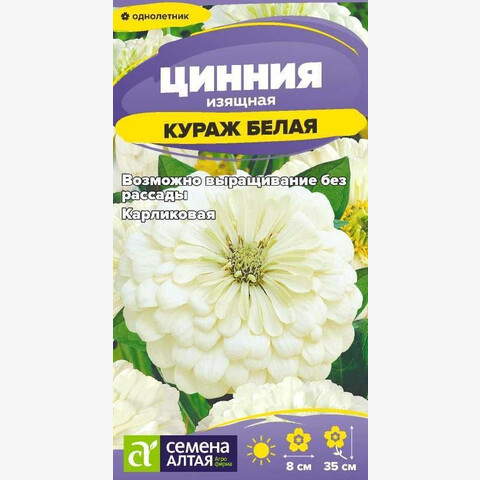 Великолепная цинния с суперобильным и длительным цветением. Образует компактные сильноветвящиеся кустики высотой до 35 см, с множеством махровых полушаровидных соцветий белой окраски, диаметром до 8 см, расположенных среди зеленой листвы. Соцветия не выгорают на солнце, и длительное время сохраняют декоративность в срезке. Растение отличается высокой устойчивостью к неблагоприятным погодным условиям. Используется для оформления клумб, рабаток, эффектно будет смотреться в балконных ящиках и в качестве горшечной культуры. Растение относительно засухоустойчиво, но требует регулярных поливов, чувствительно даже к легким заморозкам. Предпочитает солнечные, защищенные от ветра теплые участки с дренированной нейтральной, богатой гумусом и минеральными элементами почвой. Посевы на рассаду проводят с конца марта под стекло. Глубина заделки семян 0,5 см. При температуре +22…+25°С всходы появляются на 7-10 день. С развитием первой пары настоящих листочков сеянцы пикируют в отдельные горшочки. В фазе 5-6 листьев проводят формирующую прищипку. В открытый грунт на постоянное место рассаду высаживают в конце мая – начале июня, когда минует угроза заморозков. Схема посадки – 20х20 см. Возможен прямой посев семян в открытый грунт в мае. Продолжительность цветения с июля до осенних холодов. Удаление увядших соцветий способствует более пышному и продолжительному цветению.