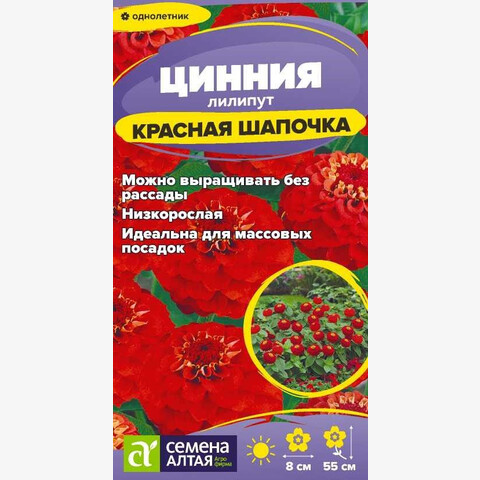 Великолепная цинния с изящными полушаровидными соцветиями! Декоративно цветущее однолетнее растение, отличающееся от других цинний низкорослостью (высота кустиков до 55 см) и более мелким размером соцветий. Махровые соцветия – корзинки, диаметром 6-8 см, многочисленные полушаровидные ярко-красной окраски. Каждый цветок держится на растении до 35 дней. Благодаря яркости и длительности цветения, сорт используют как выразительный акцент в цветочных композициях. Прекрасно подойдет для групповых посадок на клумбах, рабатках, великолепно смотрится в срезке. Растение относительно засухоустойчиво, но требует регулярных поливов, чувствительно даже к легким заморозкам. Предпочитает солнечные, защищенные от ветра теплые участки с дренированной нейтральной, богатой гумусом и минеральными элементами почвой. Посевы на рассаду проводят с конца марта под стекло. Глубина заделки семян 0,5 см. При температуре +22…+25°С всходы появляются на 7-10 день. С развитием первой пары настоящих листочков сеянцы пикируют в отдельные горшочки. В фазе 5-6 листьев проводят формирующую прищипку. В открытый грунт на постоянное место рассаду высаживают в конце мая – начале июня, когда минует угроза заморозков. Посадочный интервал – 30-40 см. Возможен прямой посев семян в открытый грунт в мае. Продолжительность цветения с июля до осенних холодов. Удаление увядших соцветий способствует более пышному и продолжительному цветению.