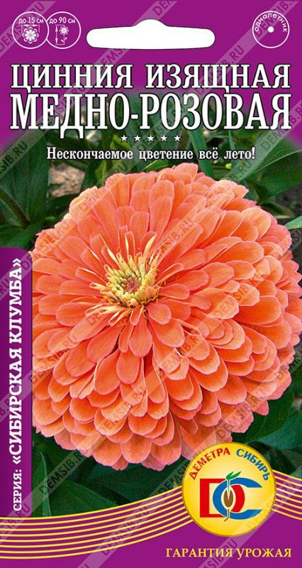 Высокорослая, обильноцветущая цинния с плотными, полушаровидными, махровыми соцветиями диаметром 13-15 см. Цветы необычного медно-розового цвета. Кусты быстрорастущие, мощные, высотой 70-90 см, с множеством цветоносов. Цветение раннее и продолжительное, с июня до окончания сезона. Каждое соцветие держится на растении до 30 дней. Широко используются для выращивания на клумбах и в рабатках, отлично подходят для срезки. Срезанные цветы долго стоят в воде.