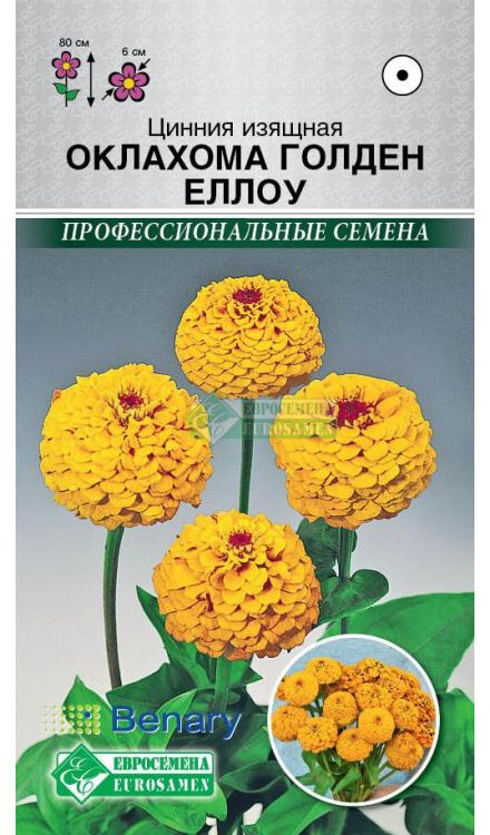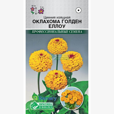 Цинния – красиво цветущее растение, образующее отдельный род семейства Астровые. Наиболее распространена она на своей исторической родине, в Мексике. Серия Оклахома - очень изящный и крайне продуктивный сорт циннии от немецкой компании Benary, который легко вырастить. Пушистые набитые соцветия теплого золотисто-желтого цвета добавят шарма везде, где она будет посажена. Цветки на длинных прочных стеблях напоминают небольшие махровые помпоны. Длинные стебли и некрупные цветки – идеальное дополнение в создании различных букетов и цветочных комбинаций с другими растениями. Великолепно смотрится в срезке, без потери своих декоративных качеств может стоять в вазе до 10 дней. Цветет очень обильно, ярко и продолжительно. Широко используется для создания ярких цветочных массивов и клумб. Идеальное растение заднего плана цветников.