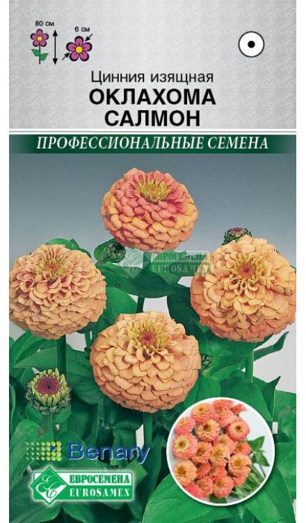 Zinnia elegans Oklahoma Salmon Цинния – красиво цветущее растение, образующее отдельный род семейства Астровые. Наиболее распространена она на своей исторической родине, в Мексике. Серия Оклахома- очень изящный и крайне продуктивный сорт циннии от немецкой компании Benary, который легко вырастить. Пушистые набитые соцветия теплого лососевого цвета добавят шарма везде, где она будет посажена. Цветки лососевой окраски на длинных прочных стеблях напоминают небольшие махровые помпоны. Длинные стебли и некрупные цветки – идеальное дополнение в создании различных букетов и цветочных комбинаций с другими растениями. Великолепно смотрится в срезке, без потери своих декоративных качеств может стоять в вазе до 10 дней. Цветет очень обильно, ярко и продолжительно. Широко используется для создания ярких цветочных массивов и клумб. Идеальное растение заднего плана цветников.
