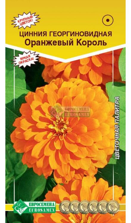 Цинния — цветок из Южной Мексики, который очень популярен среди садоводов и ландшафтных дизайнеров. В середине XVIII века это декоративное растение украшало аристократические сады, а в наше время благодаря своей красоте и неприхотливости завоевало уже весь мир. Циннии ещё называют майорами георгино- цветковыми, так как внешне они очень похожи на георгин, а цветами офицеров их прозвали за прямые жёсткие стебли и горделиво посаженные соцветия. Оранжевый король - очередной сорт из огромного разнообразия обожаемых в народе, цинний. Еще более многолика и щедра она на цветение. С июля будет радовать крупными цветками насыщенной оранжевой окраски и не потеряет своей романтичности до заморозков. Вас ожидает осенний фейерверк из крупных цветков по случаю окончания лета, с блеском впишется во все цветочные композиции, заполняя промежутки между соседними растениями и, наиболее выигрышно подчеркнет их красоту.