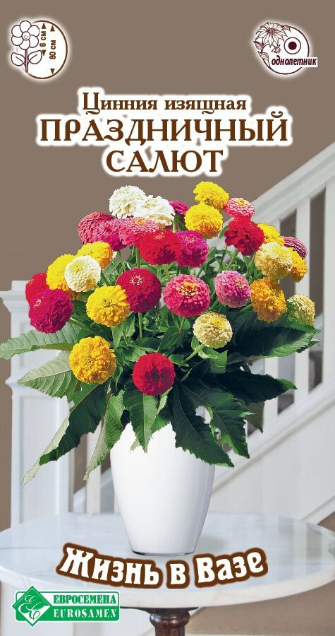 Цинния – красиво цветущее растение, образующее отдельный род семейства Астровые. Наиболее распространена она на своей исторической родине, в Мексике. Праздничный Салют - очень изящный и крайне продуктивный сорт циннии, который легко выращивать. Пушистые набитые соцветия различных цветовых оттенков добавят шарма везде, где она будет посажена. Цветки на длинных прочных стеблях напоминают махровые помпоны. Длинные стебли и некрупные цветки – идеальное дополнение в создании различных букетов и цветочных комбинаций с другими растениями. Великолепно смотрится в срезке, без потери своих декоративных качеств может стоять в вазе до 10 дней. Цветет очень обильно, ярко и продолжительно. Широко используется для создания ярких цветочных массивов и клумб. Идеальное растение заднего плана цветников.