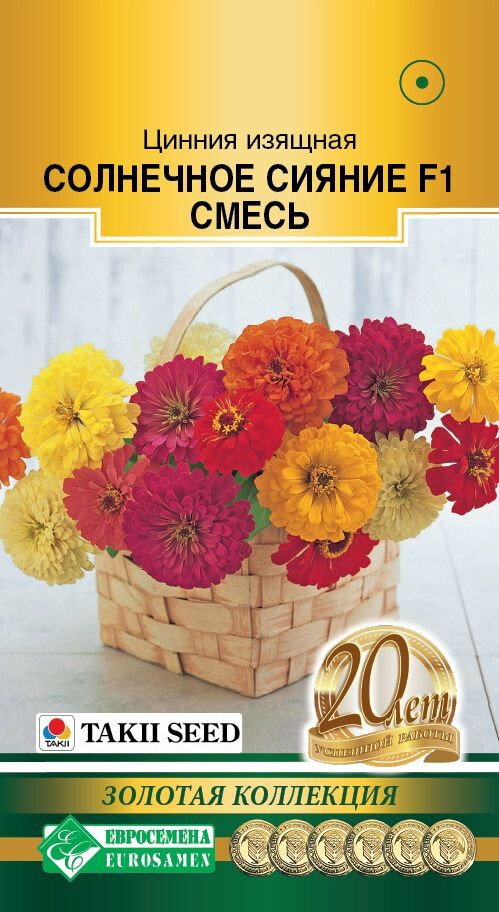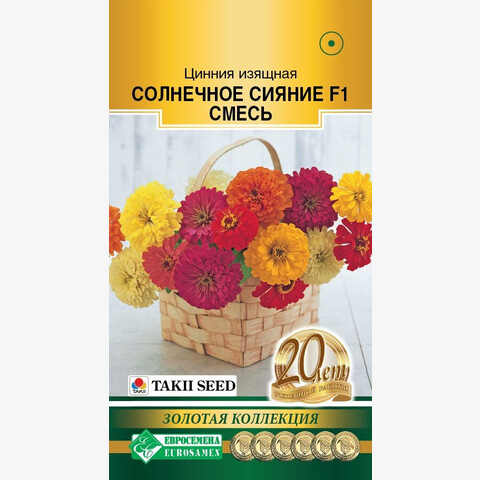 Цинния – красиво цветущее растение, образующее отдельный род семейства Астровые. Наиболее распространена она на своей исторической родине, в Мексике. Солнечное Сияние - уникальная смесь обильно цветущей циннии от компании Takii Seed, формирующая массу крупных, полностью махровых цветков. Удивительный потенциал, стабильное плотное цветение в течение всего сезона, неприхотливость и устойчивость к погодным катаклизмам - вот несомненные достоинства данной смеси. Растения отличаются сильным базальным ветвлением а крупные цветки самой разнообразной окраски обеспечивают отличное цветочное шоу как в контейнерах, так и в различных цветниках открытого грунта: рабатках, бордюрах и клумбах. Широко используется для создания ярких цветочных массивов, идеальное растение заднего плана. Зацветает через 60 дней после посева.