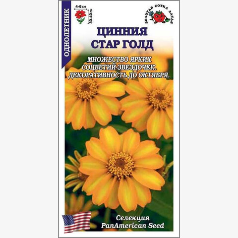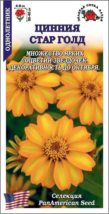Высокодекоративная и одна из наиболее неприхотливых разновидностей цинний. Кустики компактные, ветвистые, с красивой листвой и множеством простых, но невероятно эффектных соцветий желтого цвета с оранжевым оттенком по краям лепестков. Циннии Стар устойчивы к болезням, отлично развиваются и в прохладную погоду, и в жару, обильно цветут до октября. Великолепны в цветниках и горшках.
