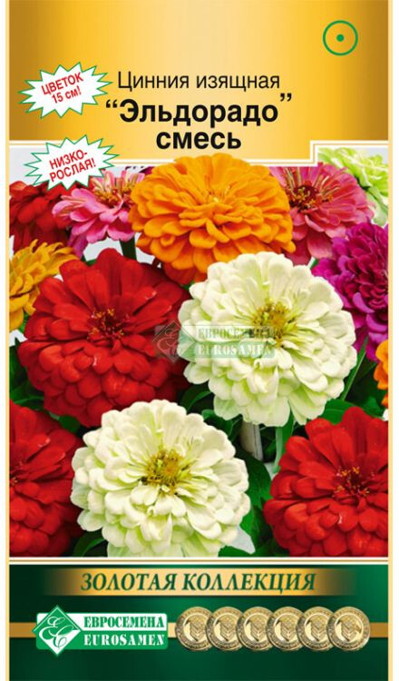 Модная Италия в лучшем виде! Низкорослая цинния, да к тому еще с очень крупным густомахровым цветком поражает суперобильным, длительным цветением; каждый цветок держится на растении более месяца. Если не знать точно, что перед вами – сорт, то циннии группы Эльдорадо по внешнему виду легко принять за гибрид в первом поколении. Растения устойчивы к жаре, хорошо выдерживают самые высокие температуры. Один из лучших сортов для горшечного выращивания на солнечных балконах и террасах. В садовых цветниках подходит для бордюров, переднего края смешанных цветников и посадок сплошными массивами. Она заслуживает того, чтобы Вы обратили на нее свое внимание. Цинния хорошо сочетается с ноготками, бархатцами, мелкоцветковыми хризантемами, вербеной.