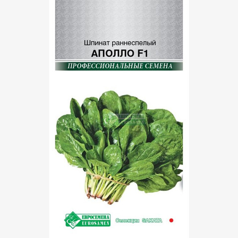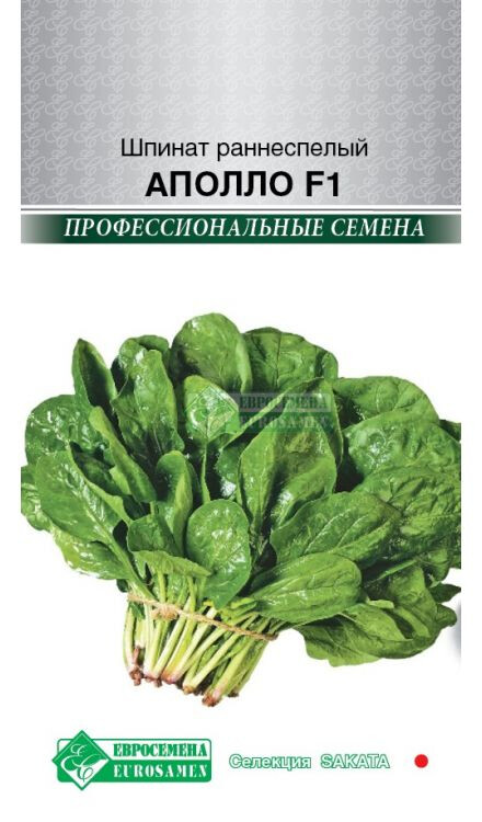 Шпинат — культура вкусная, быстрорастущая и целебная. Уход — минимальный, а урожай — максимально полезный. К тому же шпинат можно замораживать и хранить до следующего сезона. Шпинат содержит легкоусвояемые белки, углеводы, а также много калия, магния, железа, фосфора, йода, витамины А, В, С, В1 В2, В9, D, Р, Е, Н, РР, К и секретин, способствующий лучшему пищеварению. Регулярное потребление шпината способствует нормальной работе сердца. Аполло- раннеспелый (35 дней от всходов до технической спелости) гибрид открытого грунта для весеннего и осеннего выращивания, имеет хорошую силу роста и устойчивость к пероноспорозу. Листья зеленого цвета, овально-округлой формы, со слегка гофрированной поверхностью. Толщина и гофрированность листа обеспечивают гибриду высокую урожайность и пригодность для переработки.